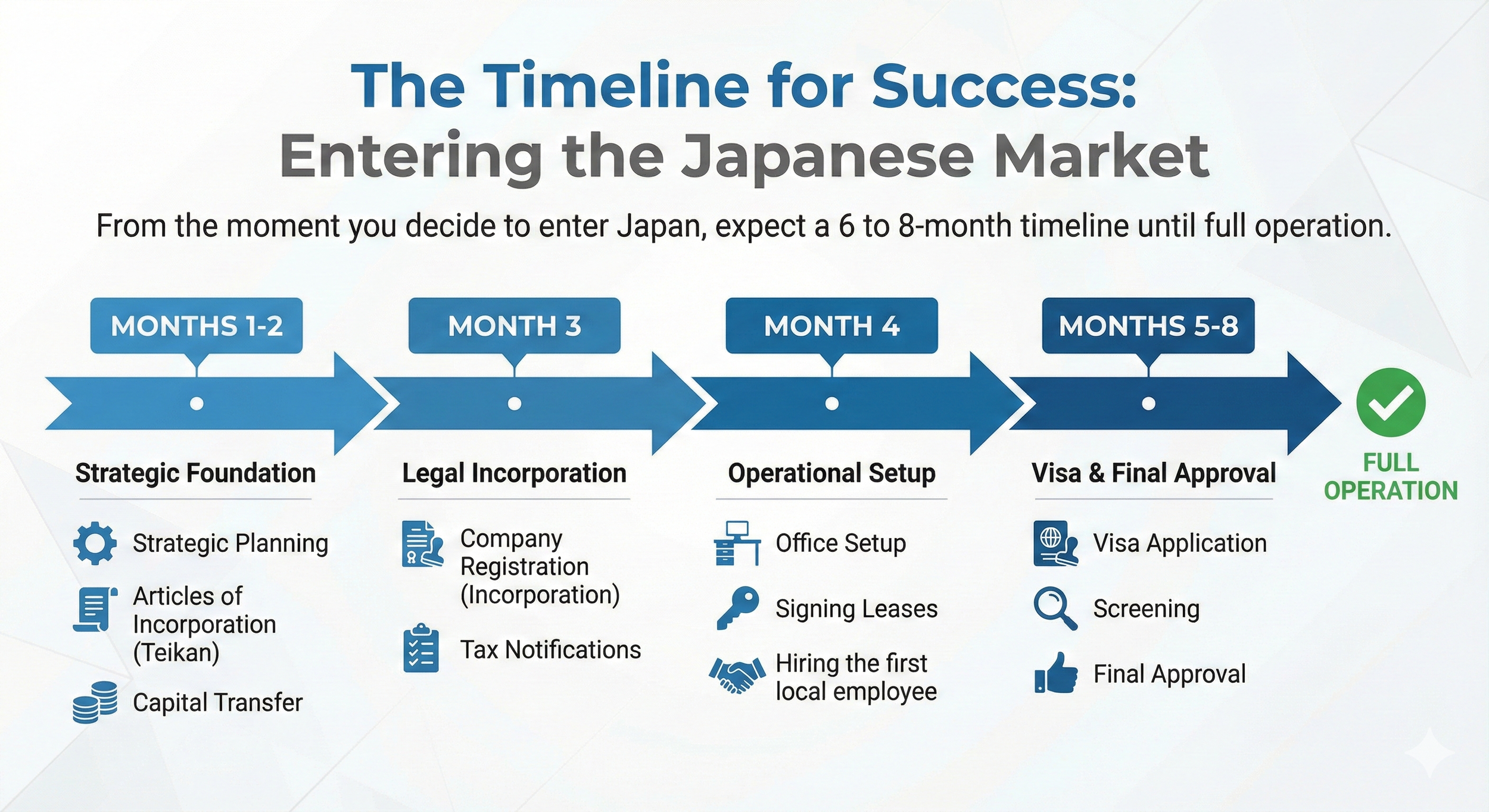 Months 1-2: Strategic planning, Articles of Incorporation (Teikan), and Capital Transfer.