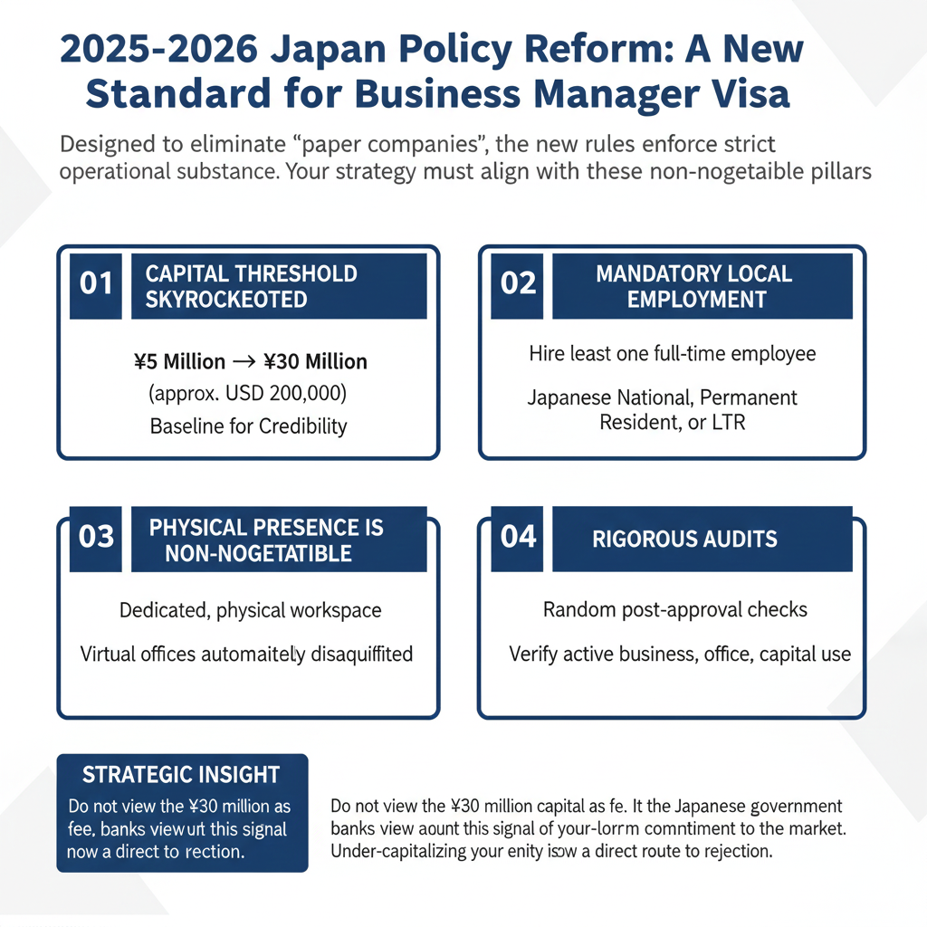The most critical update for any foreign founder is the structural change to the "Business Manager" residence status. Designed to eliminate "paper companies," the new rules enforce strict operational substance.